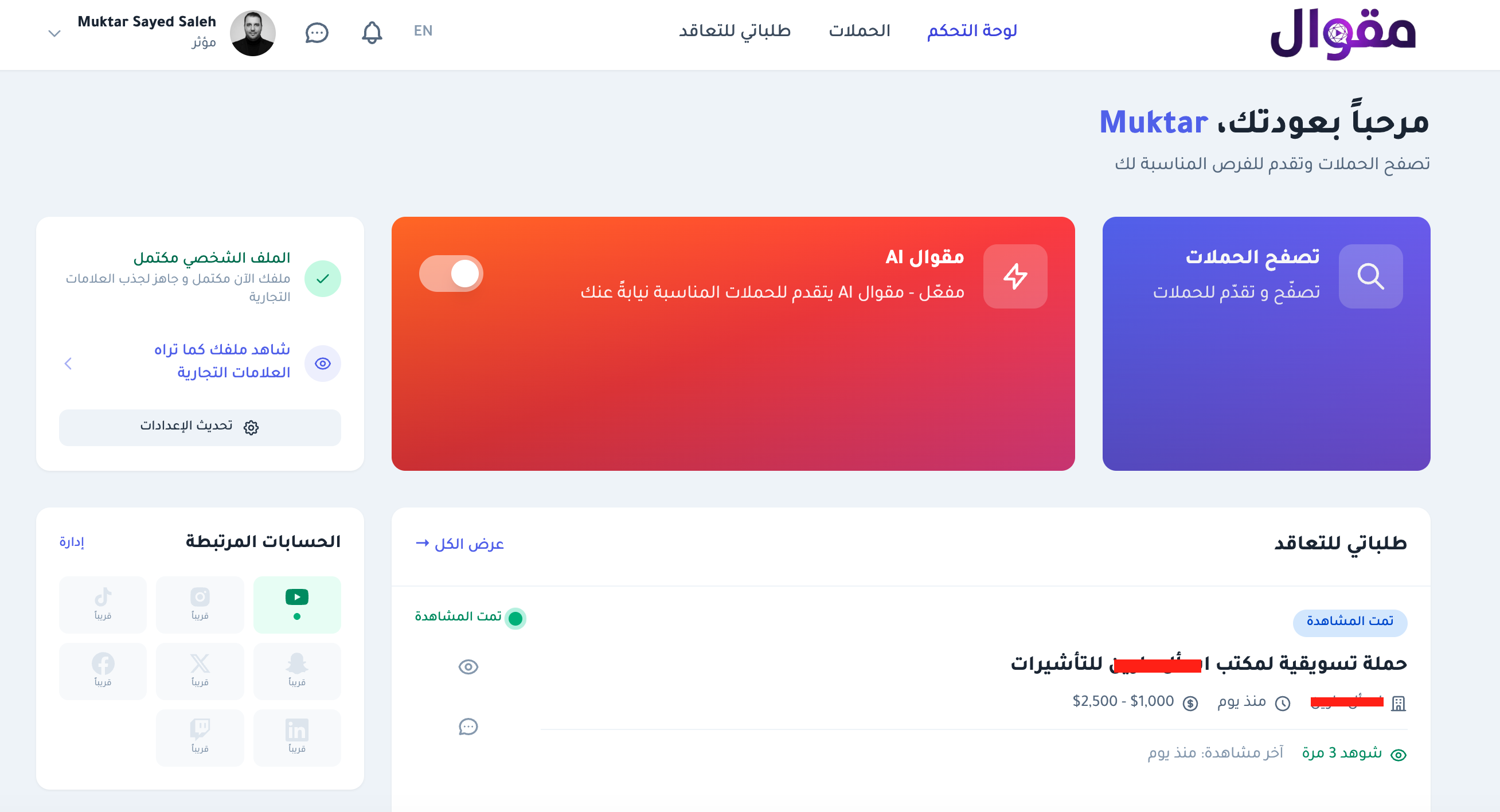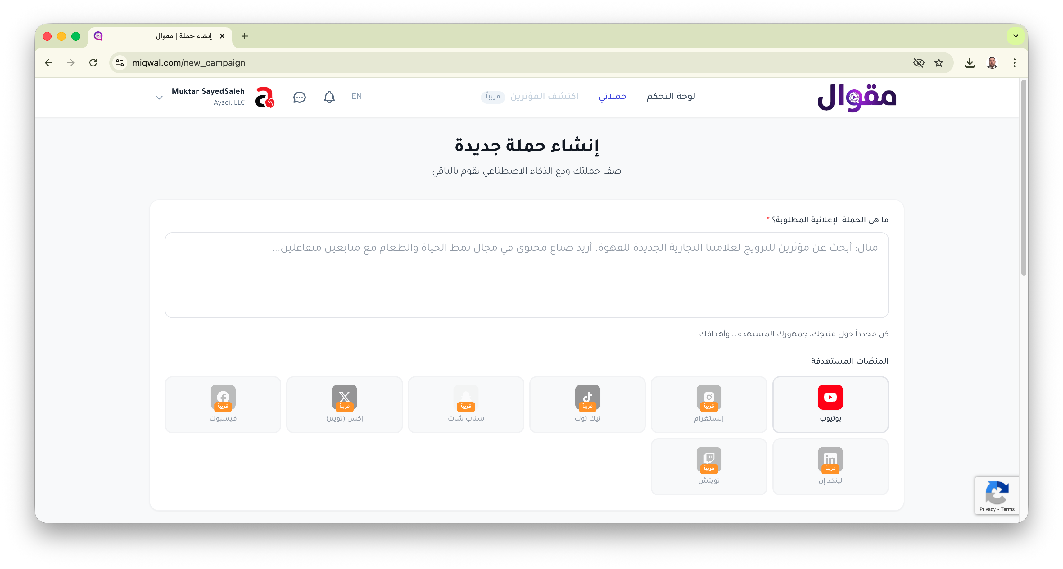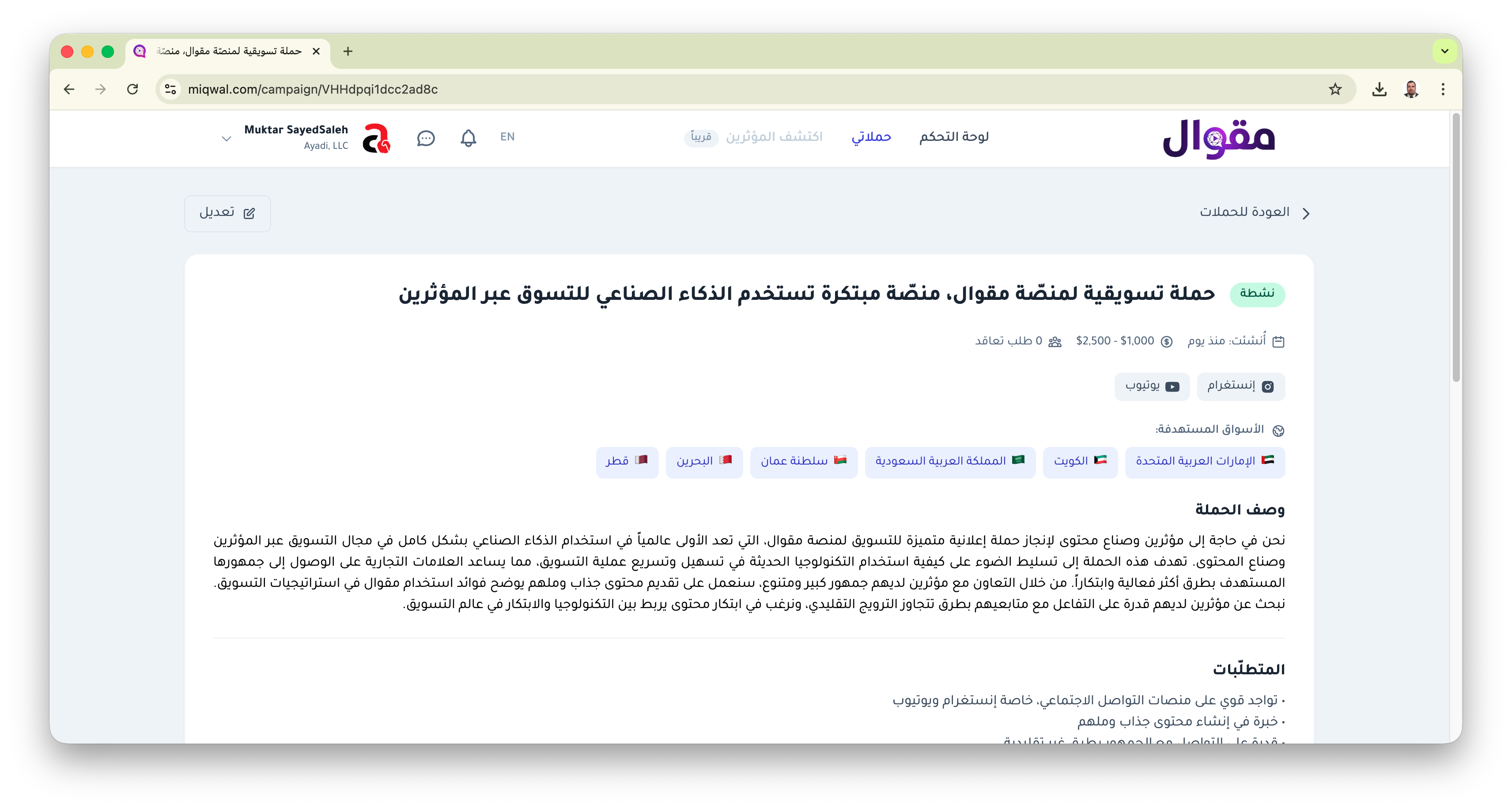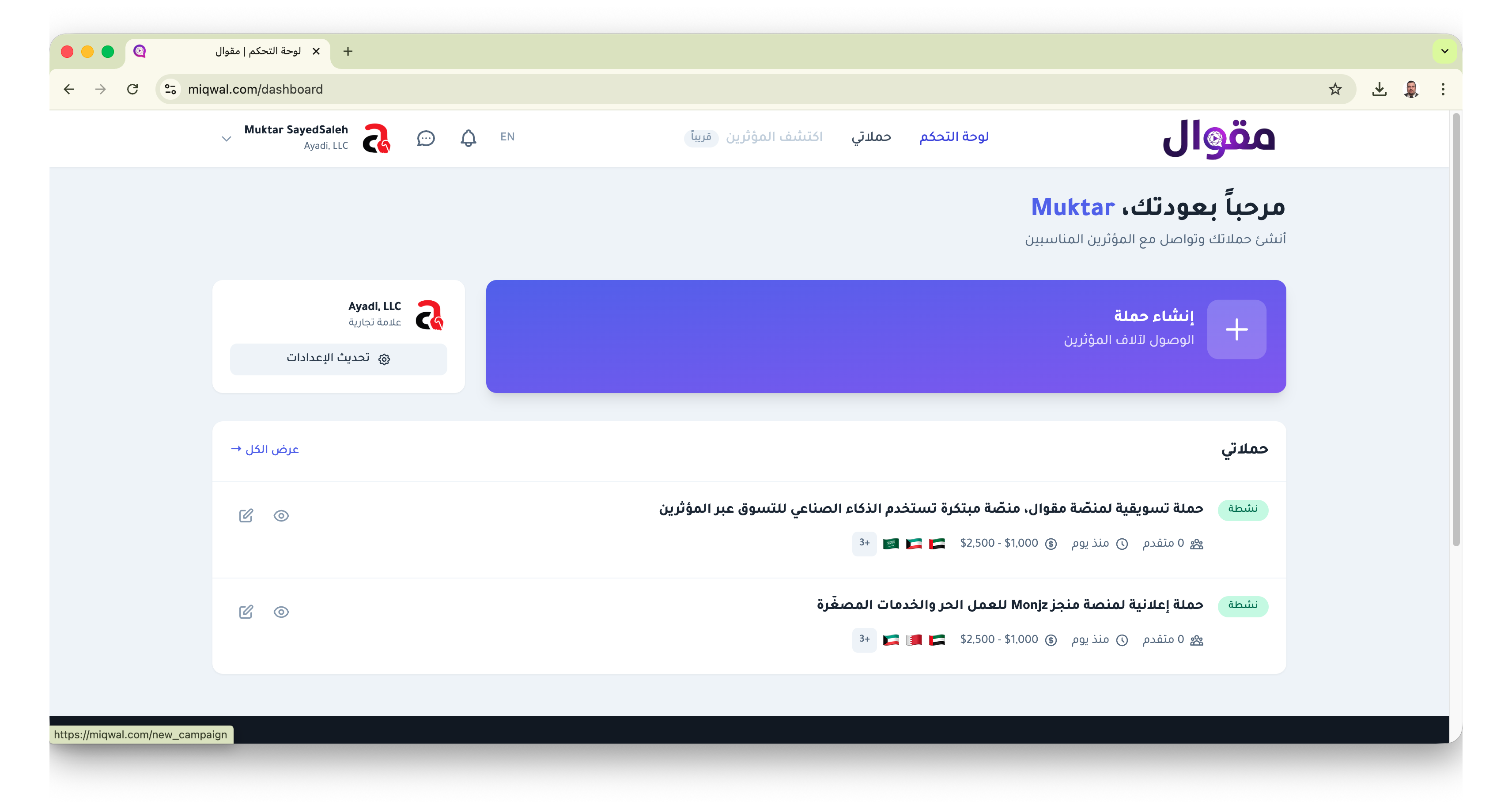 مقوال هي أول منصة في العالم تستخدم الذكاء الاصطناعي بالكامل لربط العلامات التجارية بالمؤثرين. تديرها وتشغلها شركة Ayadi, LLC المسجلة في الولايات المتحدة الأمريكية.