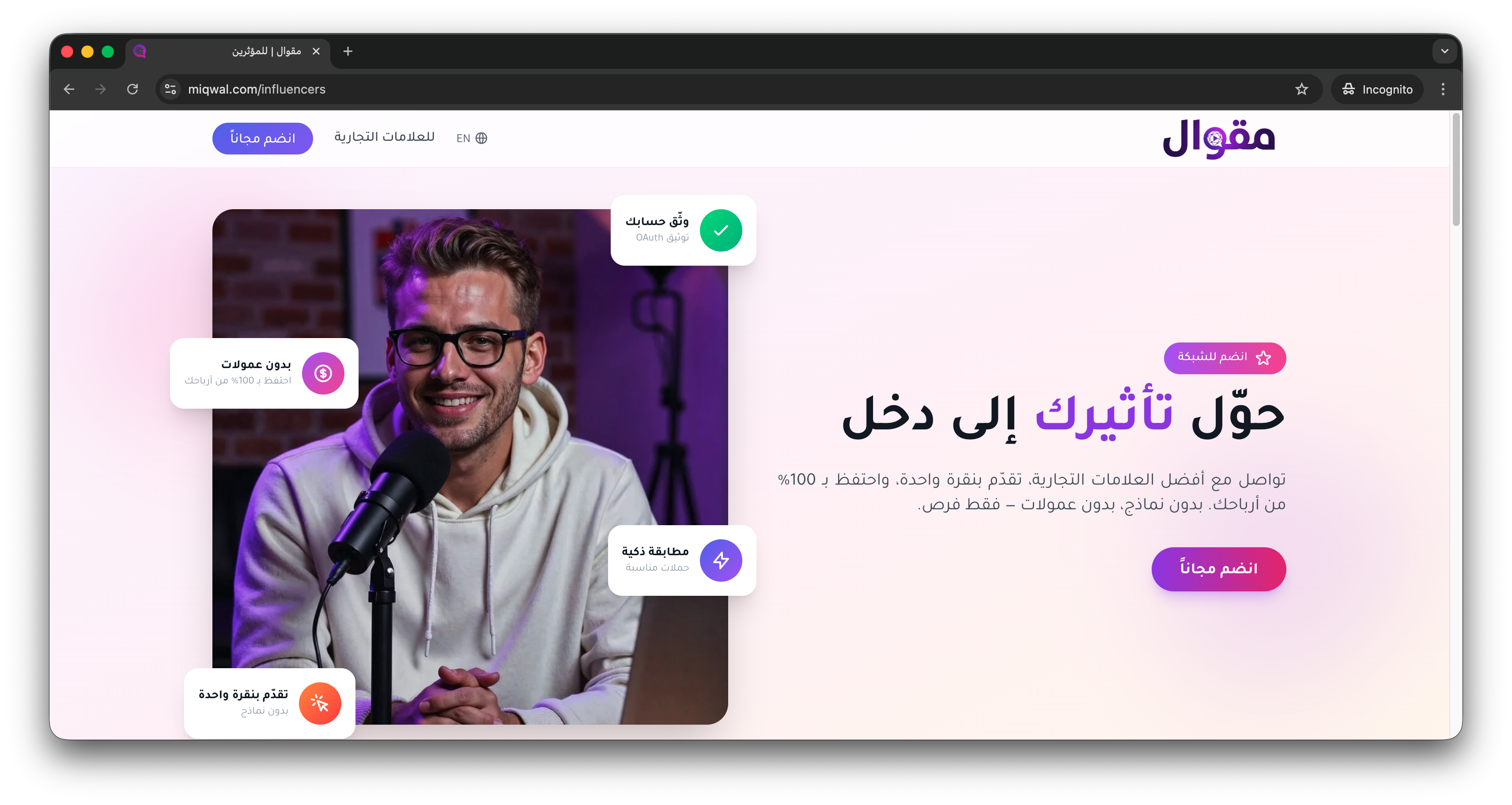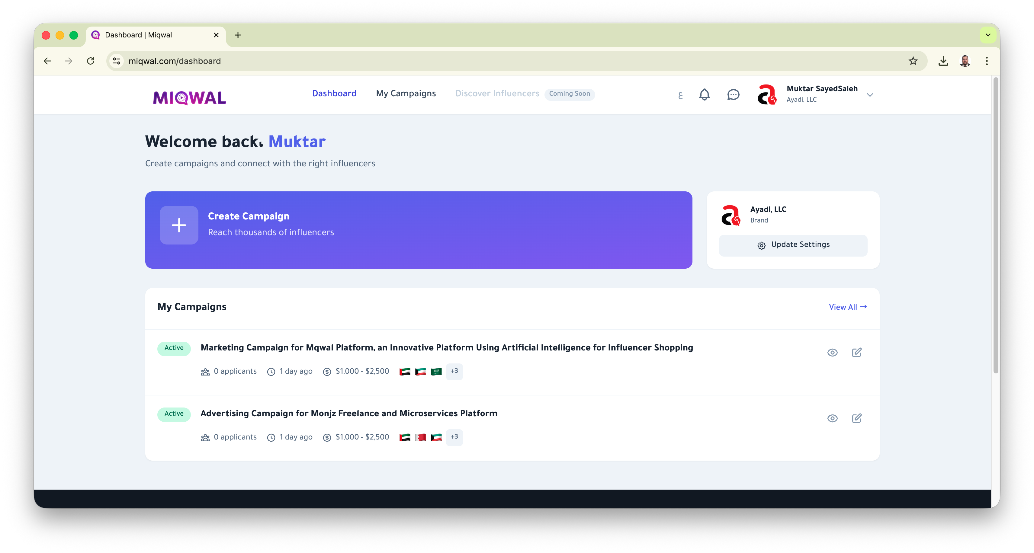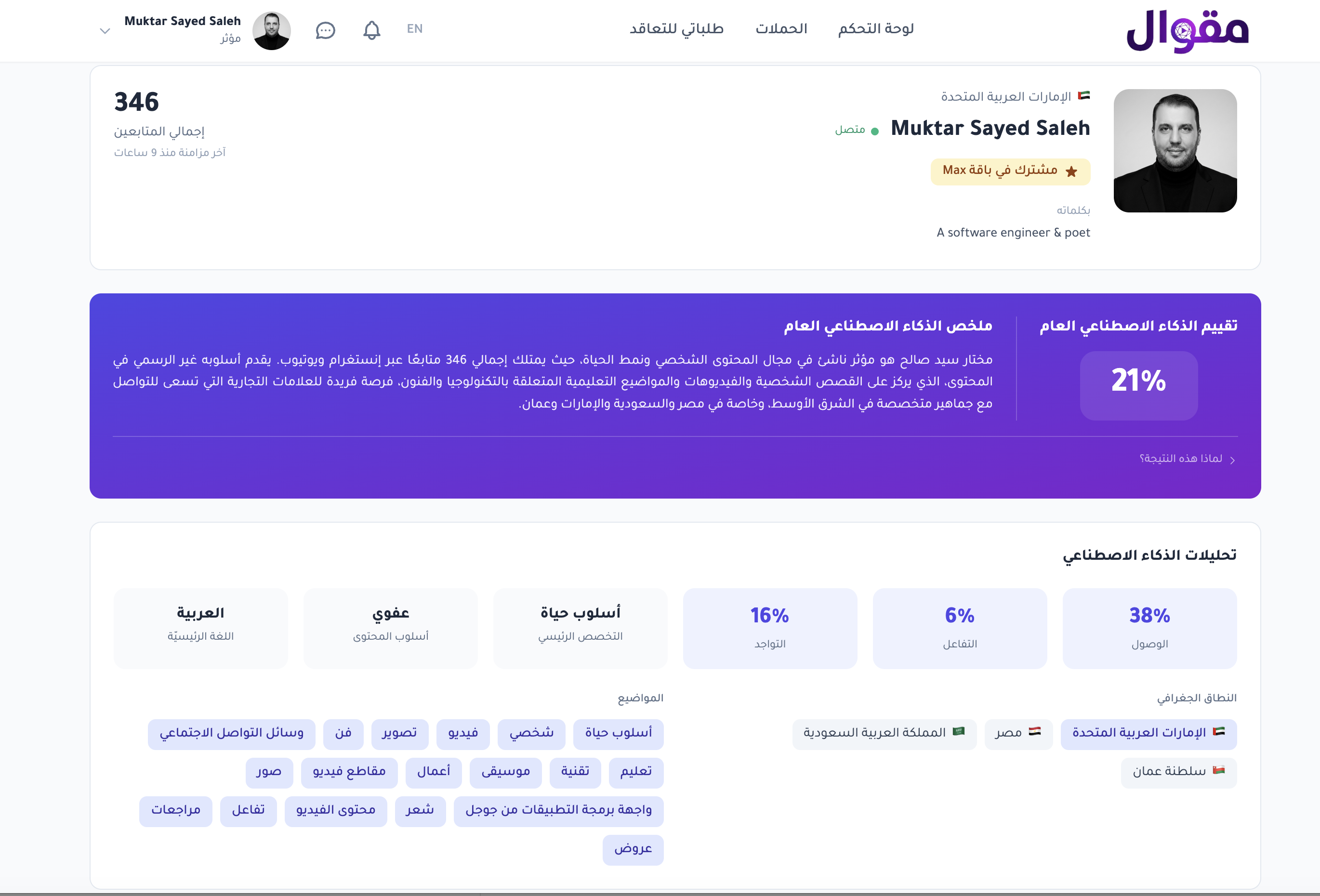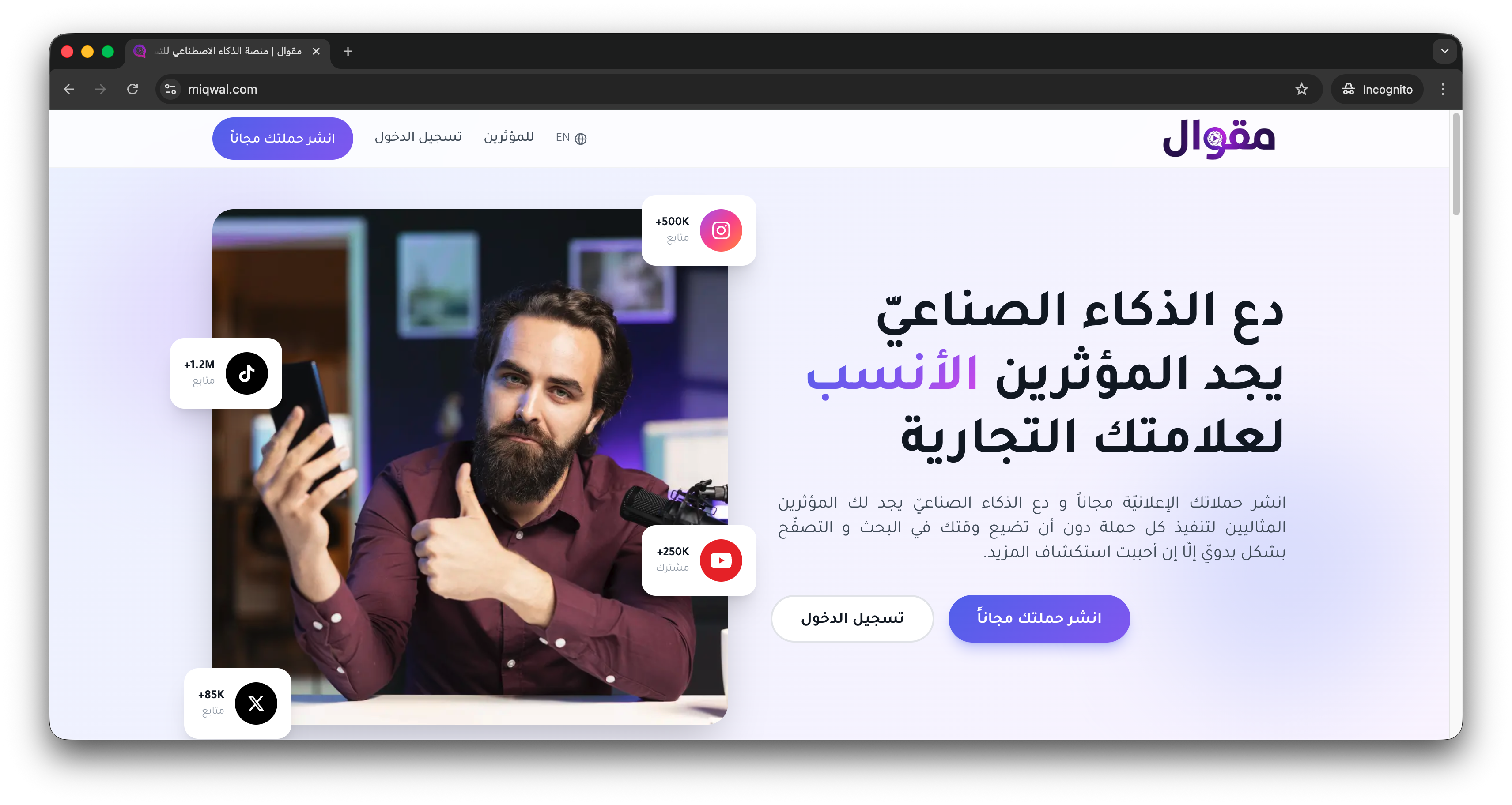 مقوال هي أول منصة في العالم تستخدم الذكاء الاصطناعي بالكامل لربط العلامات التجارية بالمؤثرين. تديرها وتشغلها شركة Ayadi, LLC المسجلة في الولايات المتحدة الأمريكية.