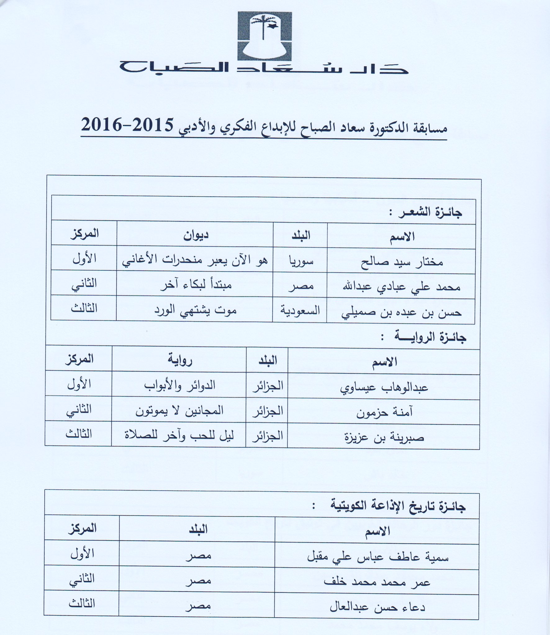 ديوان شعر, فائز بالمركز الأول, جائزة سعاد الصباح للإبداع الفكري و الأدبي 2017.