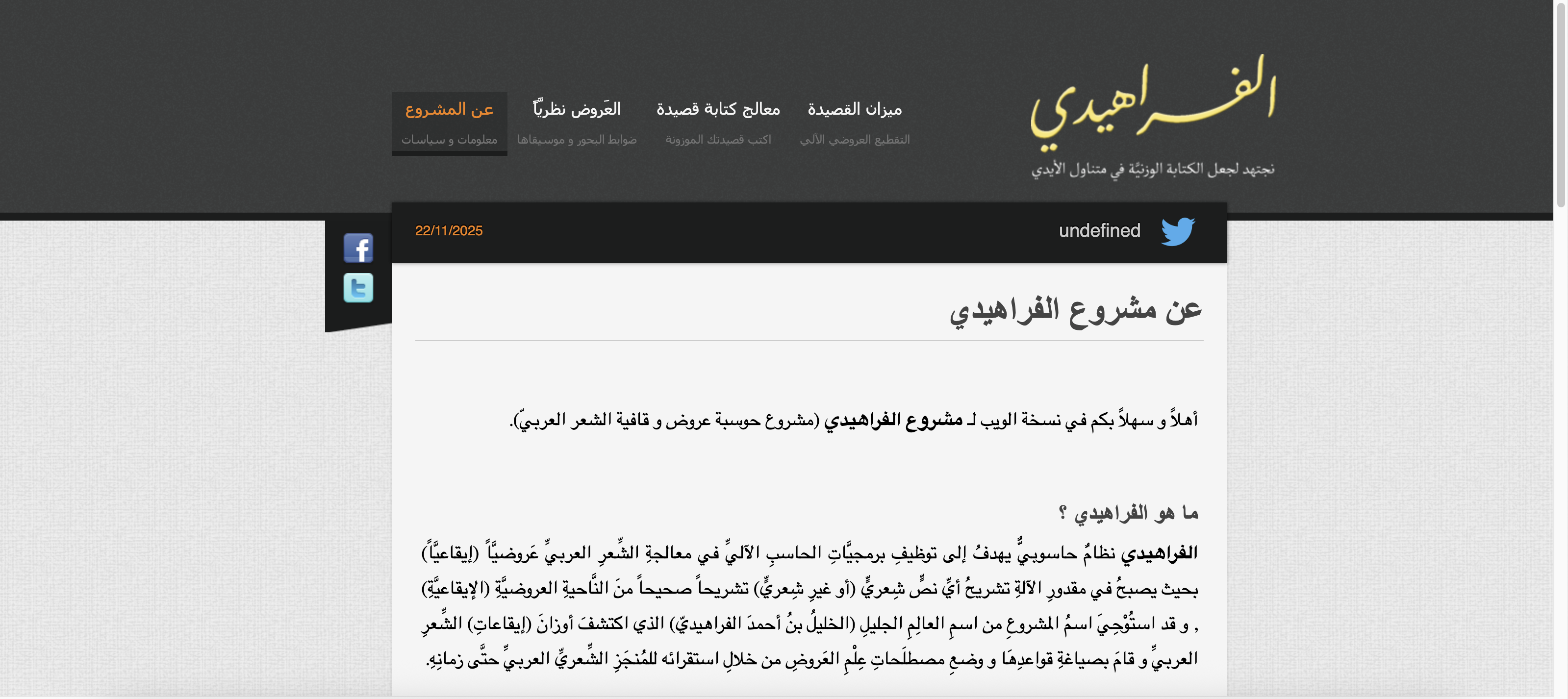 نظامٌ حاسوبيٌّ يهدفُ إلى توظيفِ برمجيَّاتِ الحاسبِ الآليِّ في معالجةِ الشِّعرِ العربيِّ عَروضيَّاً (إيقاعيَّاً) بحيث يصبحُ في مقدورِ الآلةِ تشريحُ أيِّ نصٍّ شِعريٍّ (أو غيرِ شِعريٍّ) تشريحاً صحيحاً منَ النَّاحيةِ العروضيَّةِ (الإيقاعيَّةِ) , و قد استُوْحِيَ اسمُ المشروعِ من اسمِ العالِمِ الجليلِ (الخليلُ بنُ أحمدَ الفراهيديّ) الذي اكتشفَ أوزانَ (إيقاعاتِ) الشِّعرِ العربيِّ و قامَ بصياغةِ قواعدِهَا و وضعِ مصطلَحاتِ عِلْمِ العَروضِ من خلالِ استقرائه للمُنجَزِ الشِّعريِّ العربيِّ حتَّى زمانِهِ.